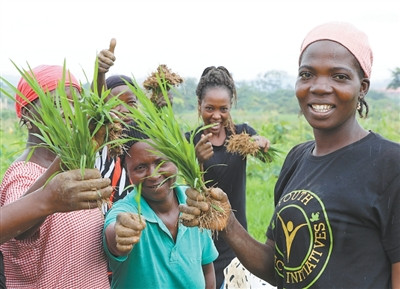 在位于阿布贾的中国援尼日利亚农业技术示范中心,当地员工展示秧苗。新华社记者 董江辉摄